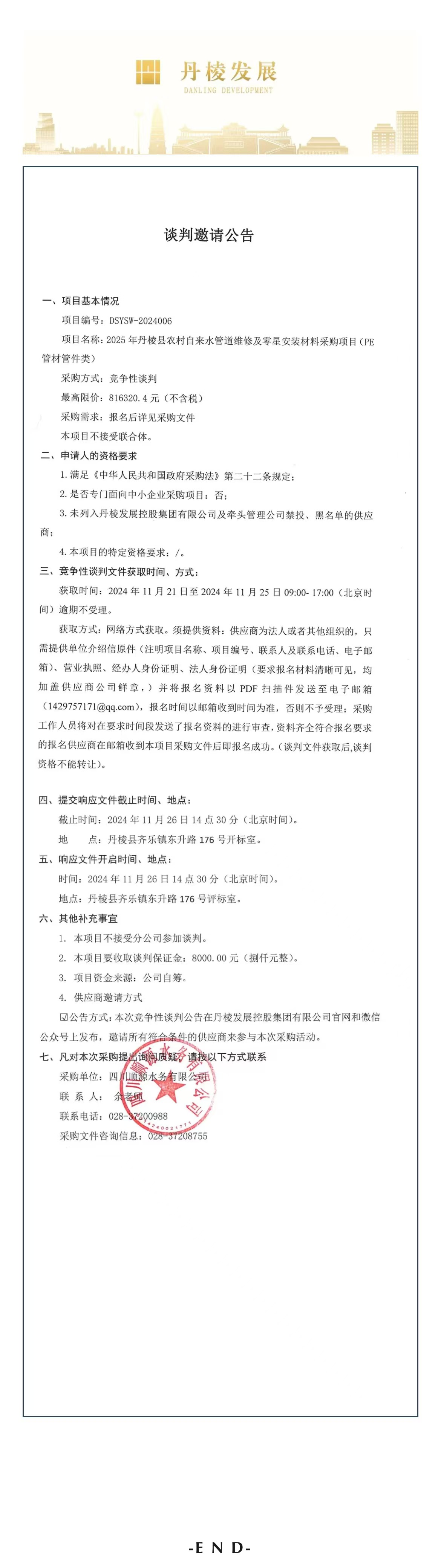 2025年丹棱縣農(nóng)村自來水管道維修及零星安裝材料采購(gòu)項(xiàng)目(PE管材管件類)談判邀請(qǐng)公告