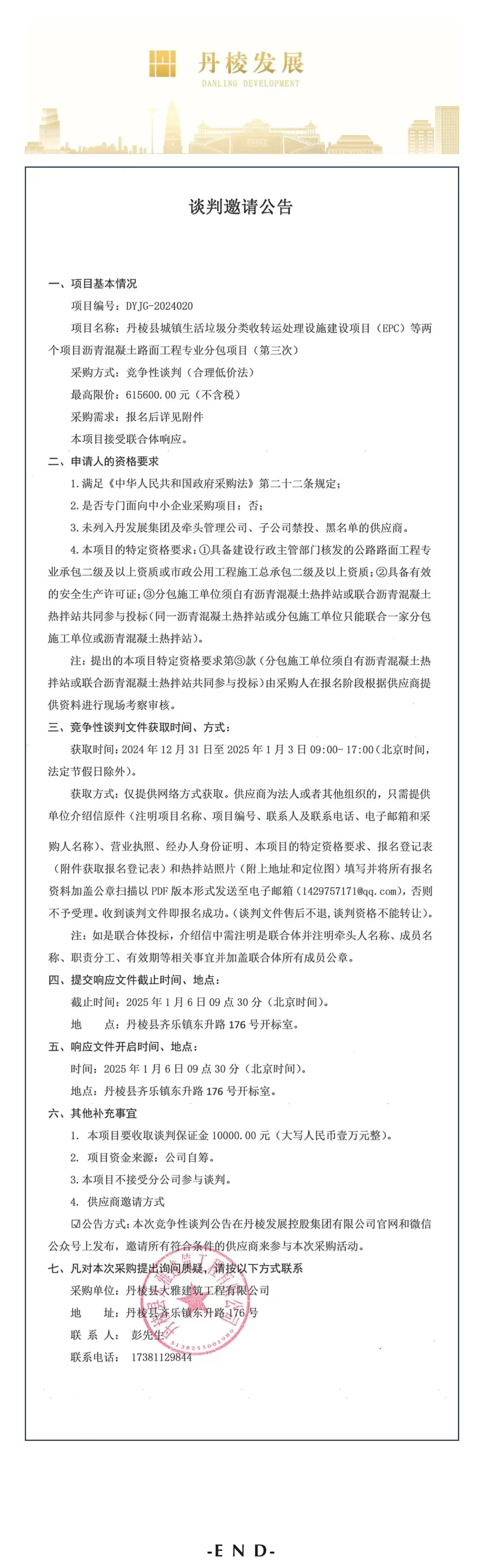 丹棱縣城鎮(zhèn)生活垃圾分類(lèi)收轉(zhuǎn)運(yùn)處理設(shè)施建設(shè)項(xiàng)目(EPC)等兩個(gè)項(xiàng)目瀝青混凝土路面工程專(zhuān)業(yè)分包項(xiàng)目(第三次)談判邀請(qǐng)公告