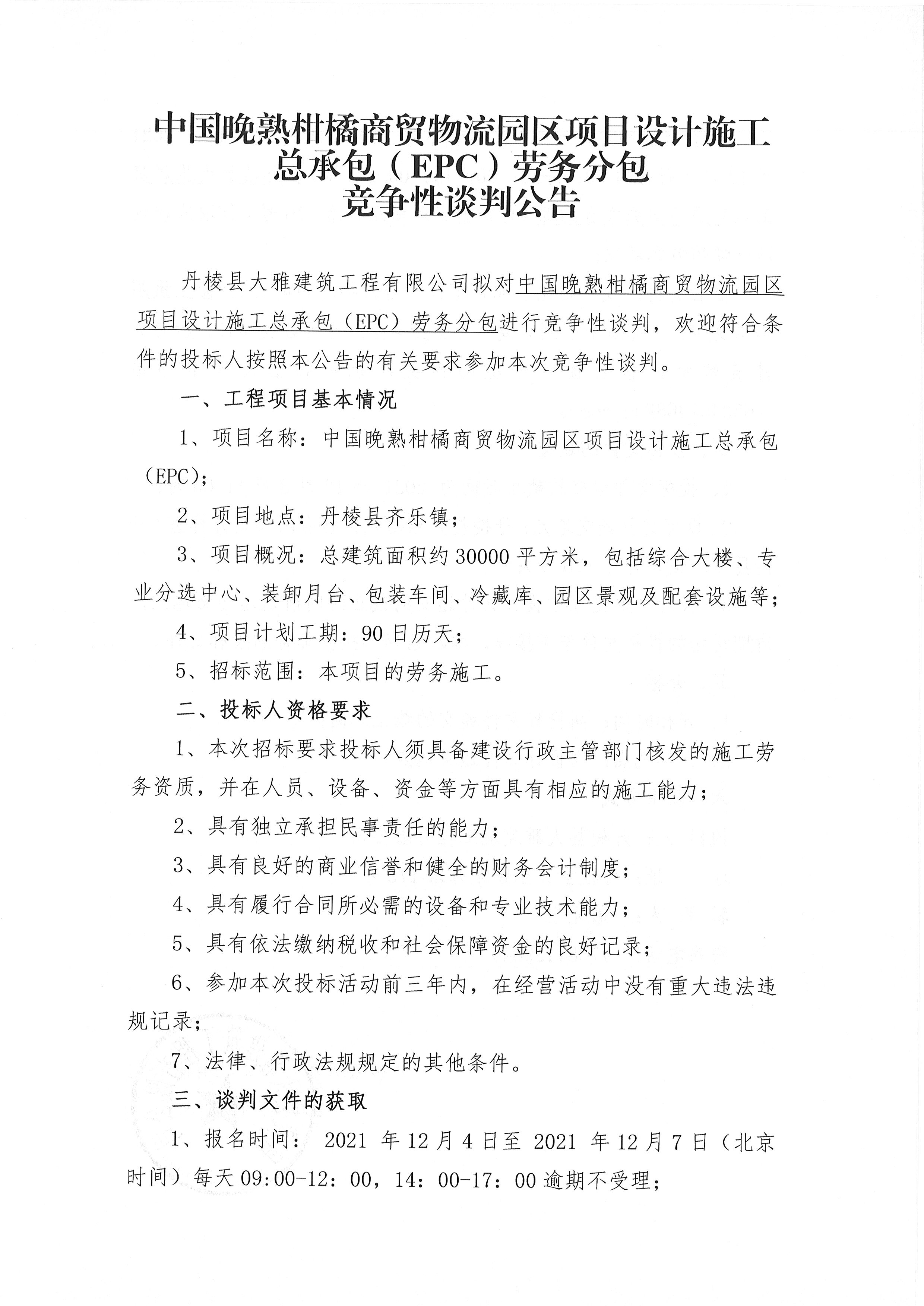 【大雅建筑公司】中國晚熟柑橘商貿(mào)物流園區(qū)項目設(shè)計施工總承包(EPC)勞務(wù)分包競爭性談判公告