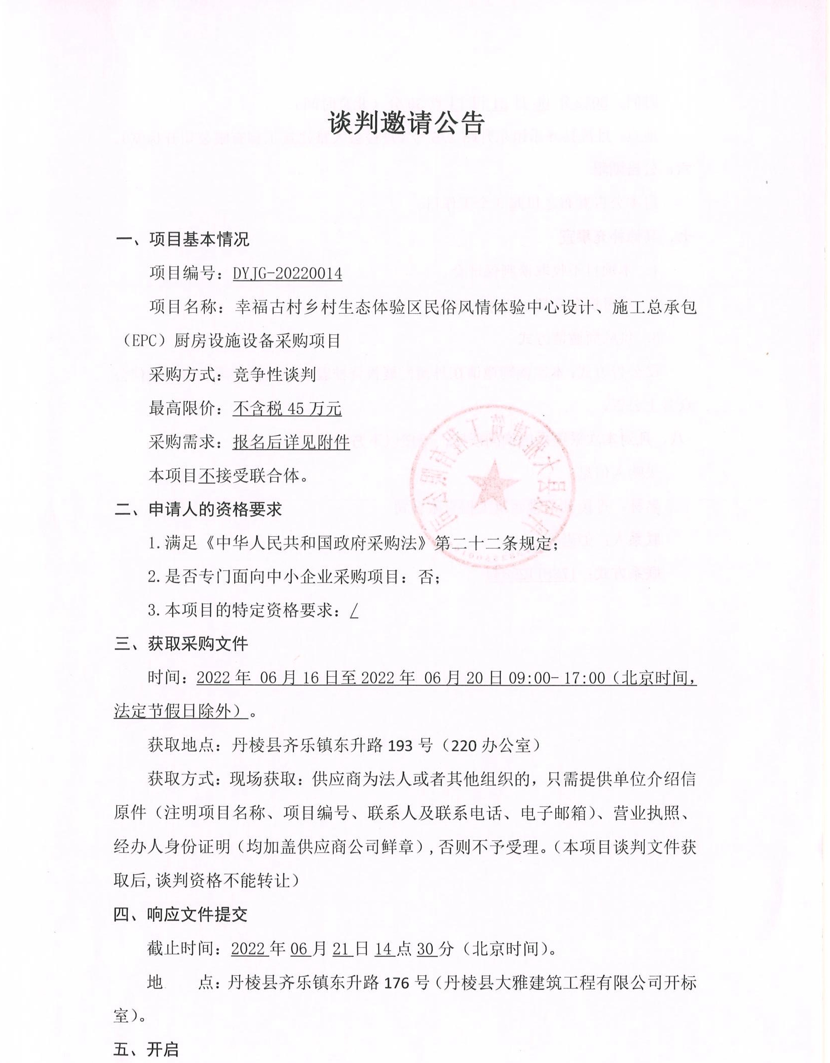 幸福古村鄉(xiāng)村生態(tài)體驗(yàn)區(qū)民俗風(fēng)情體驗(yàn)中心設(shè)計(jì)、施工總承包(EPC)廚房設(shè)施設(shè)備采購項(xiàng)目談判邀請公告