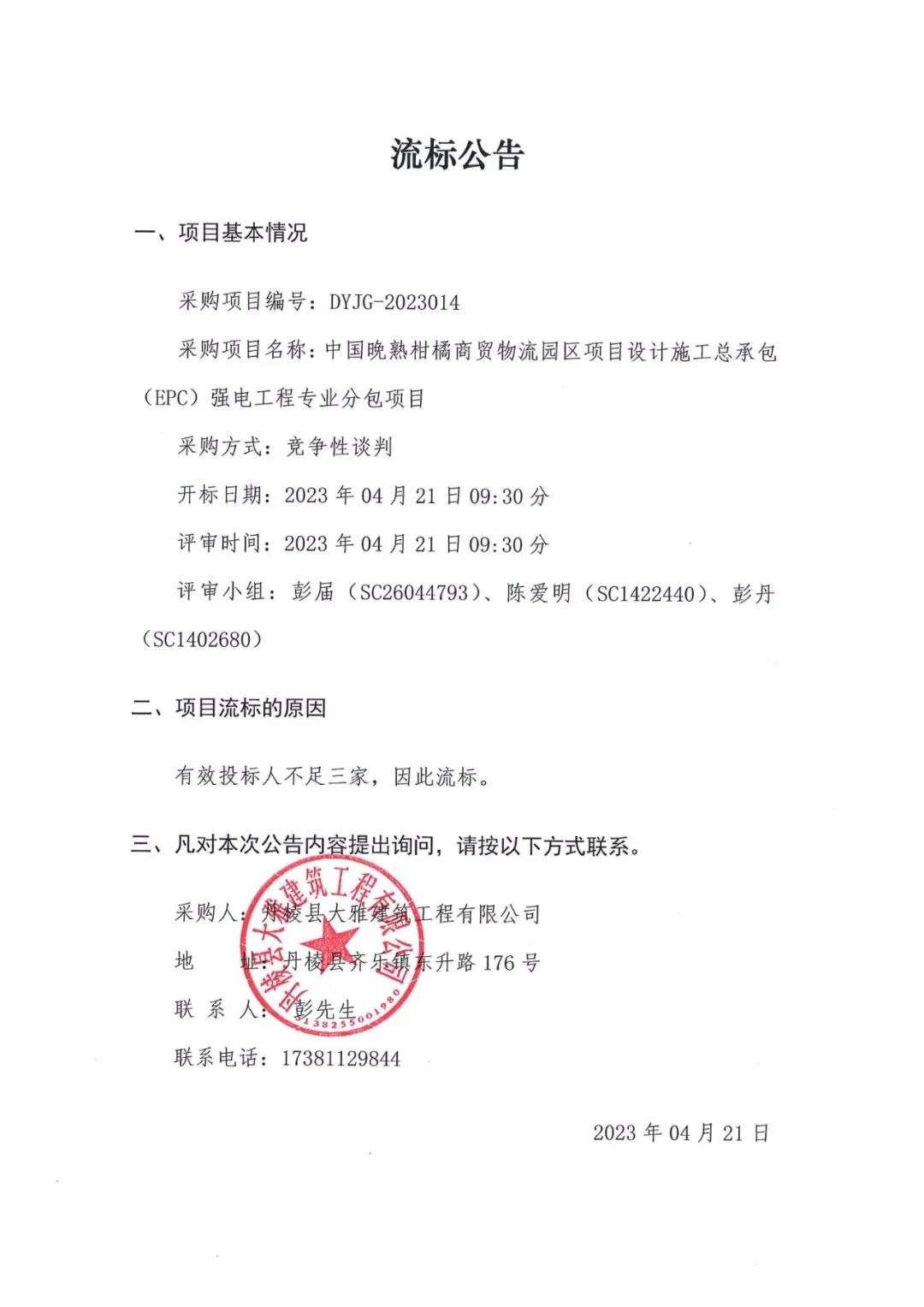 中國(guó)晚熟柑橘商貿(mào)物流園區(qū)項(xiàng)目設(shè)計(jì)施工總承包(EPC)強(qiáng)電工程專業(yè)分包項(xiàng)目流標(biāo)公告