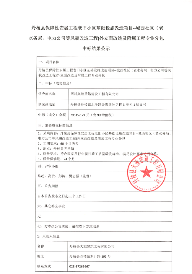 【大雅建筑公司】丹棱縣保障性安居工程老舊小區(qū)基礎(chǔ)設(shè)施改造項目--城西社區(qū)(老水務(wù)局、電力公司等風(fēng)貌改造工程)外立面改造及附屬工程專業(yè)分包中標(biāo)結(jié)果公示