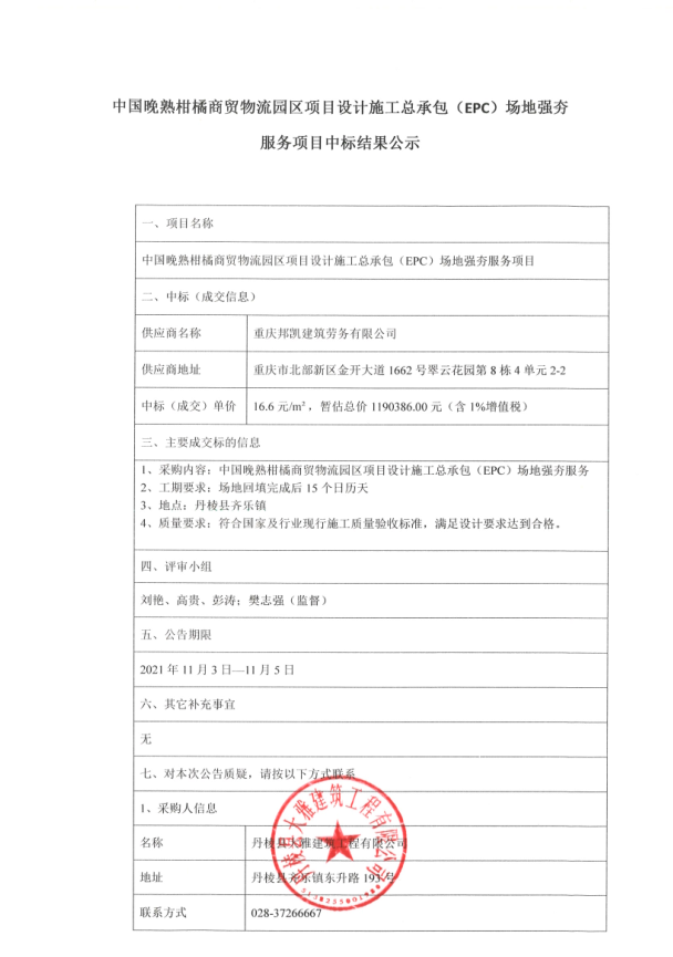 【大雅建筑公司】中國晚熟柑橘商貿物流園區(qū)項目設計施工總承包(EPC)場地強夯服務項目中標結果公示