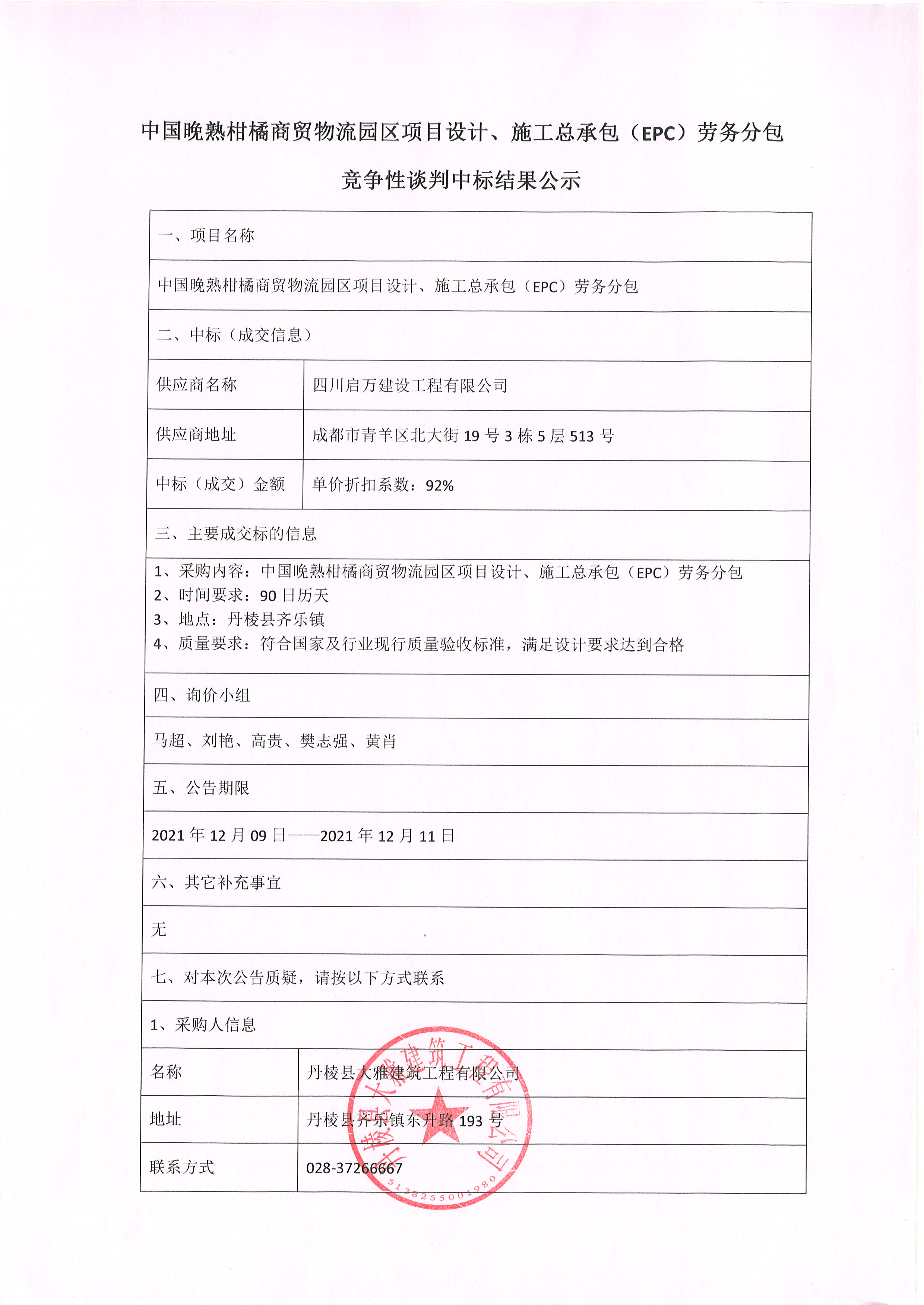 【大雅建筑公司】中國晚熟柑橘商貿(mào)物流園區(qū)項(xiàng)目設(shè)計(jì)、施工總承包(EPC)勞務(wù)分包競爭性談判中標(biāo)結(jié)果公示
