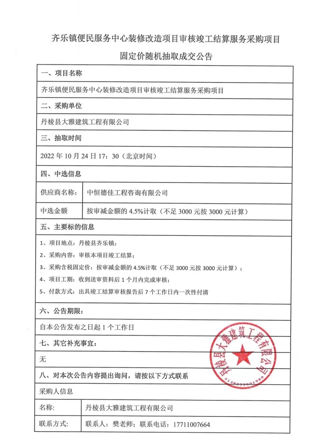 齊樂鎮(zhèn)便民服務(wù)中心裝修改造項目審核竣工結(jié)算服務(wù)采購項目固定價隨機(jī)抽取成交公告