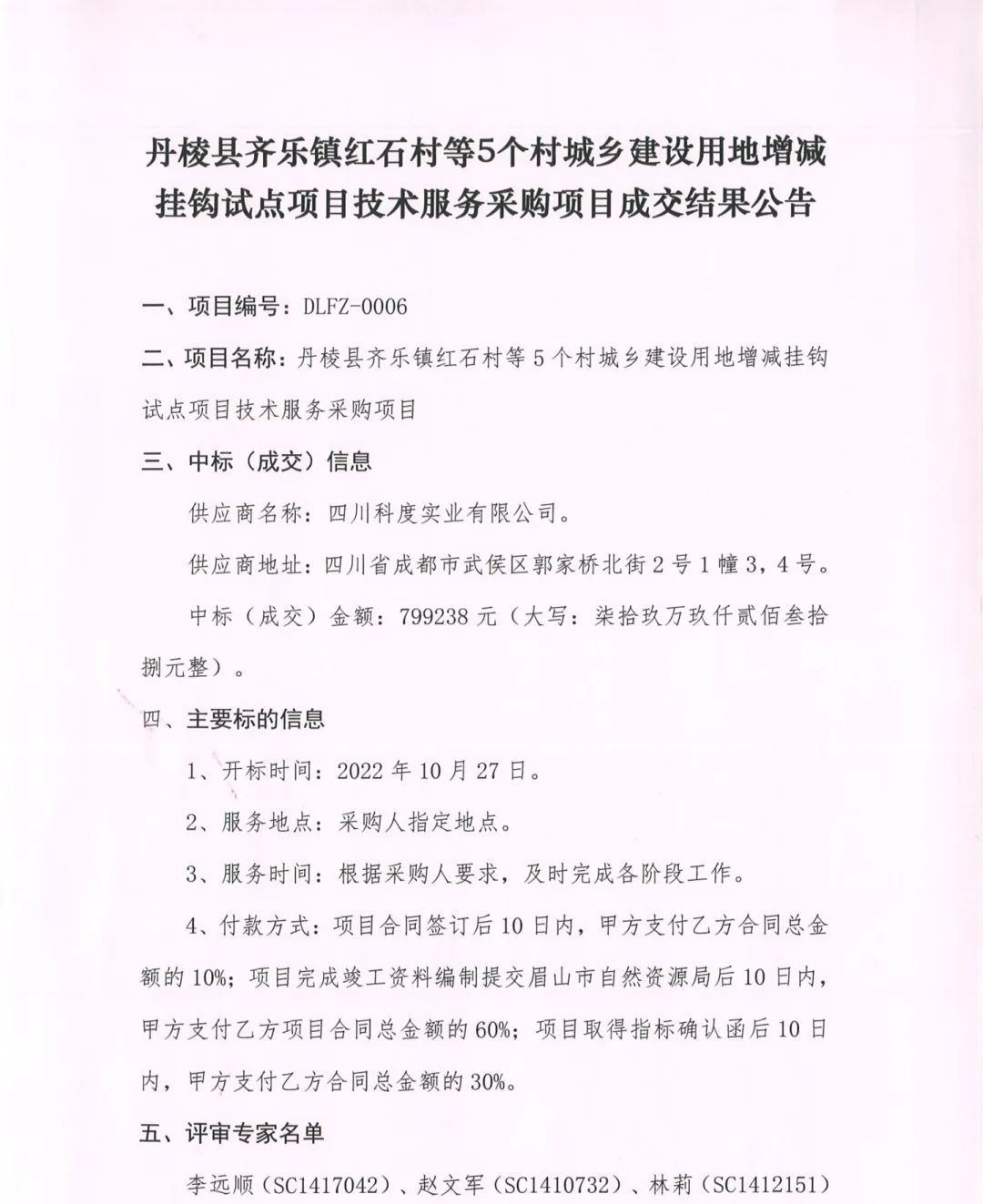 丹棱縣齊樂鎮(zhèn)紅石村等5個村城鄉(xiāng)建設用地增減掛鉤試點項目技術服務采購項目成交結果公告
