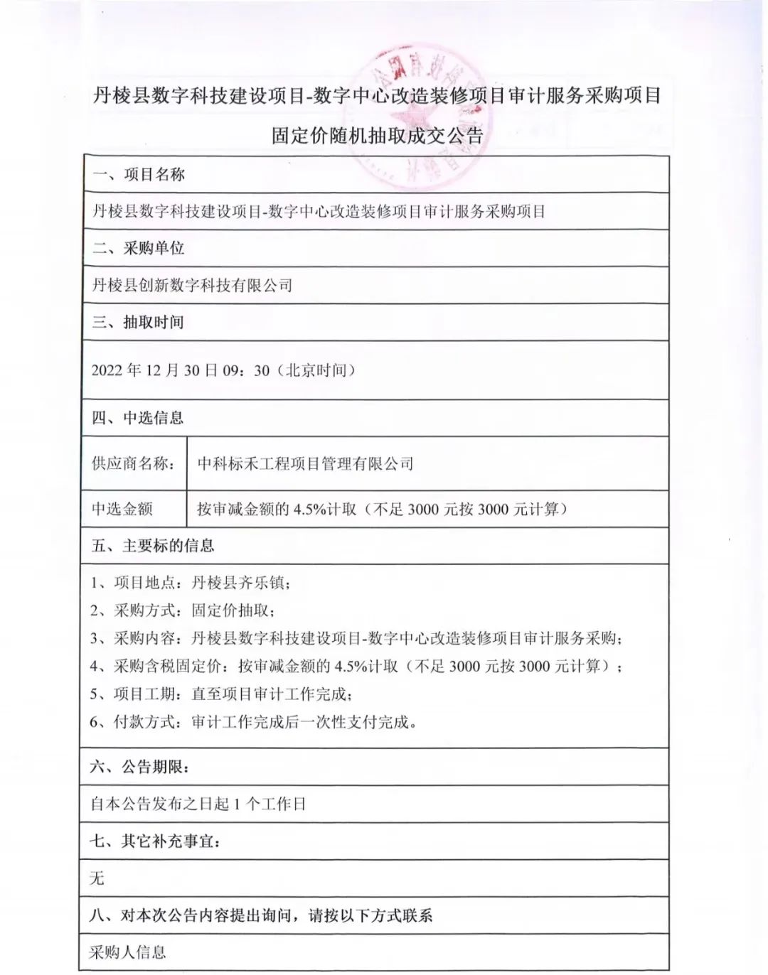 丹棱縣數(shù)字科技建設項目-數(shù)字中心改造裝修項目審計服務采購項目固定價隨機抽取成交公告
