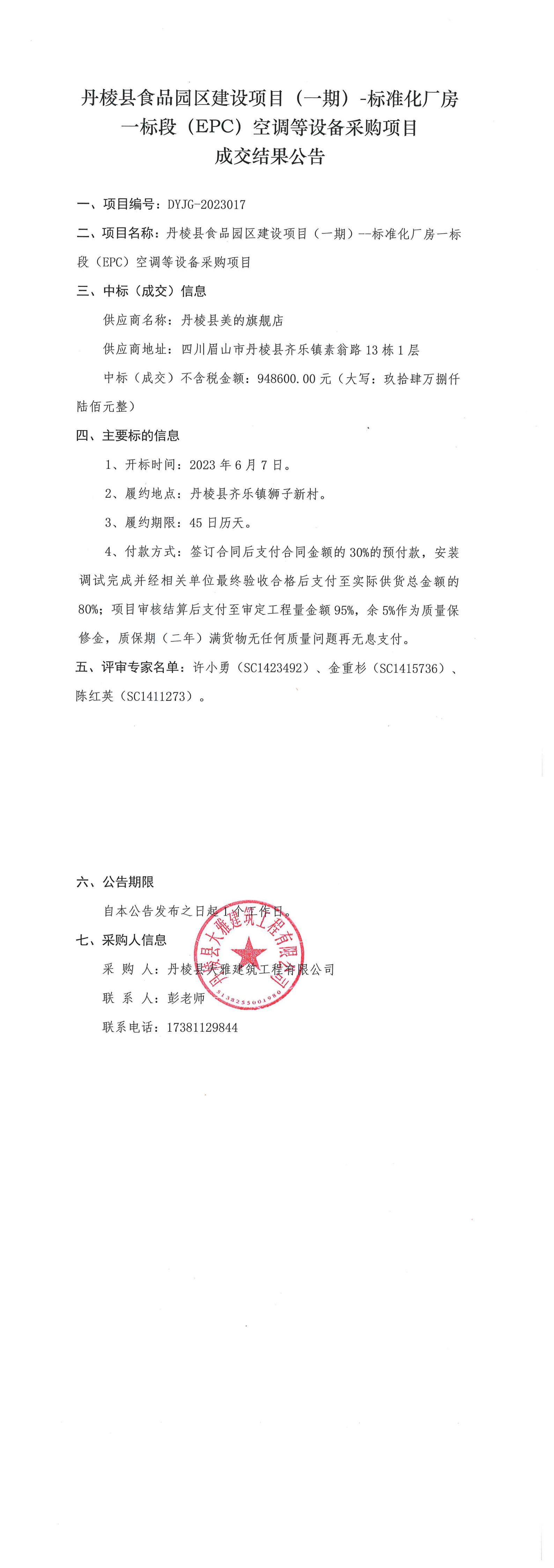 丹棱縣食品園區(qū)建設(shè)項(xiàng)目(一期)-標(biāo)準(zhǔn)化廠房一標(biāo)段(EPC)空調(diào)等設(shè)備采購(gòu)項(xiàng)目成交結(jié)果公告