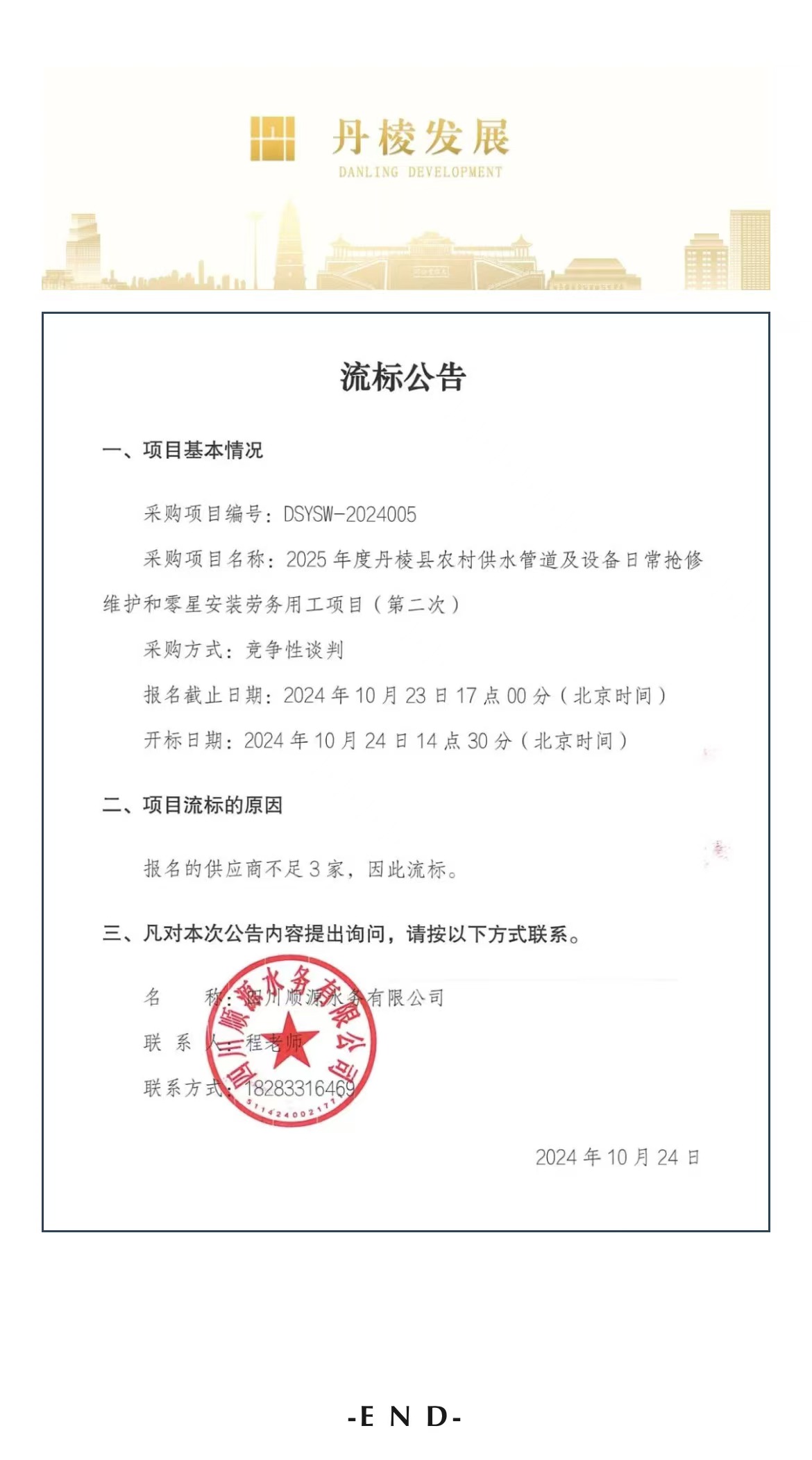 2025年度丹棱縣農(nóng)村供水管道及設(shè)備日常搶修維護和零星安裝勞務(wù)用工項目(第二次)流標(biāo)公告