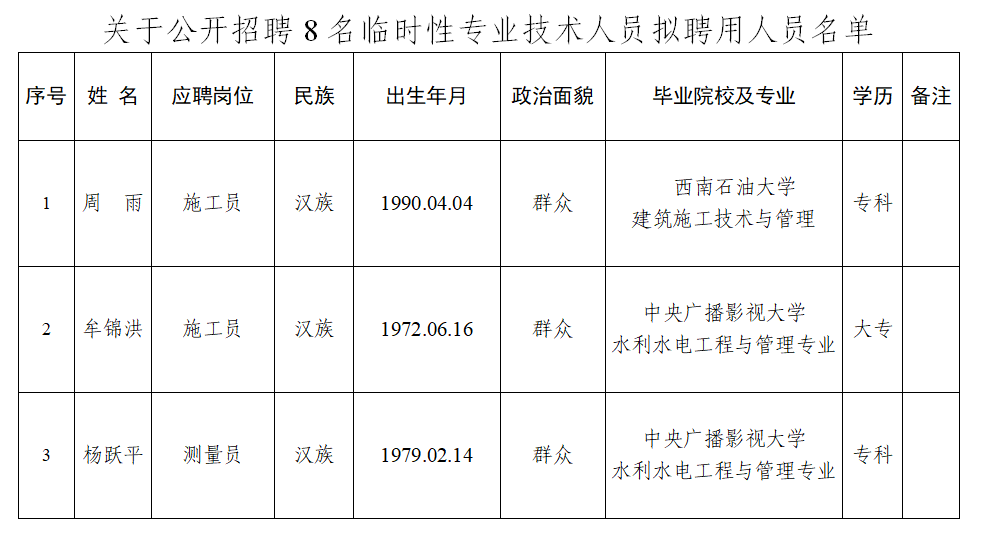 附件:關(guān)于公開(kāi)招聘8名臨時(shí)性專業(yè)技術(shù)人員擬聘用人員名單
